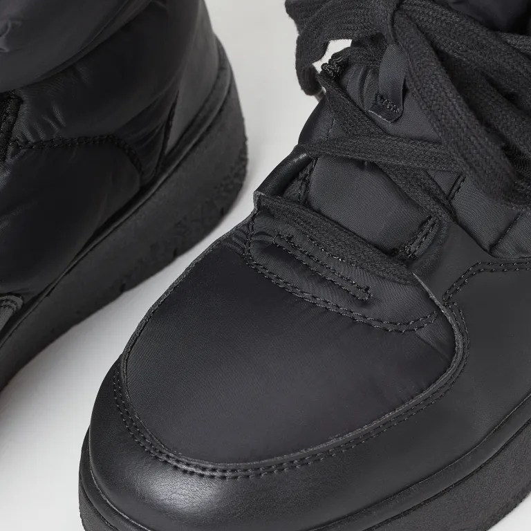 Warm-lined high tops in nylon and faux leather. Padded leg section and tongue, lacing at front, and loop at back. Chunky, patterned soles. Sole thickness 1 3/4 in.